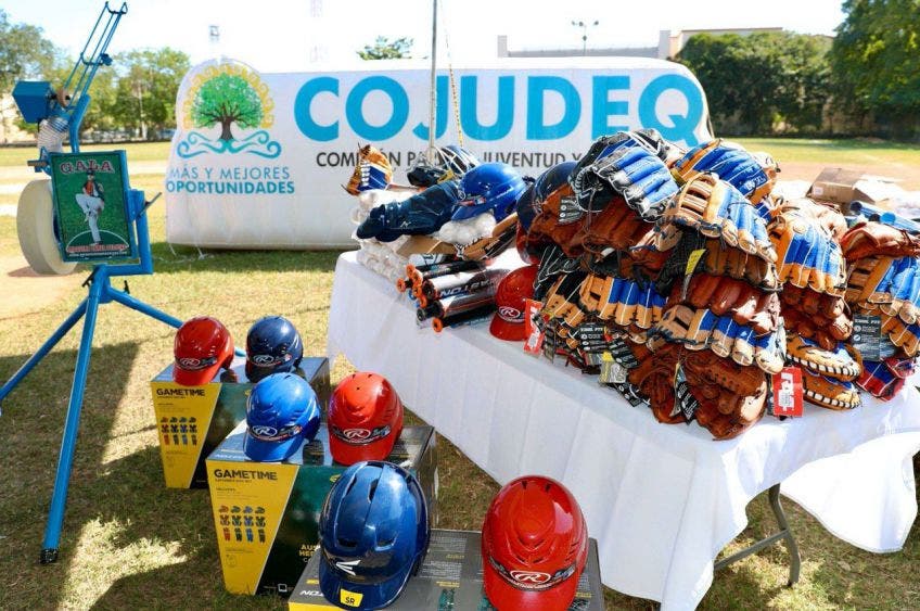 El material deportivo se entregó en el campo del “Betito Ávila” de Cancún, en donde se reunieron el gobernador Carlos Joaquín González; la presidente municipal, Mara Lezama Espinosa; Arturo Abreu Marín, representante del Gobierno de México en Quintana Roo; Ventura Peinado Bojórquez, director de proyectos de Probeis, y Antonio López Pinzón, presidente de la Comisión para la Juventud y Deporte de Quintana Roo.
