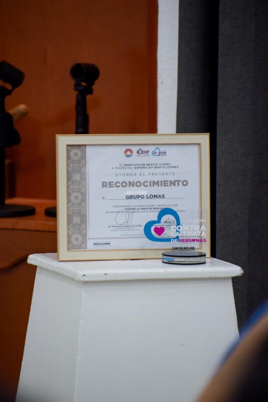 El reconocimiento fue otorgado por el secretario general del Ayuntamiento, Pablo Gutiérrez Fernández, y la directora del DIF Benito Juárez, Marisol Sendo, en representación de la presidenta municipal, Ana Paty Peralta, como símbolo del compromiso social de la empresa para prevenir este delito que vulnera la dignidad humana.