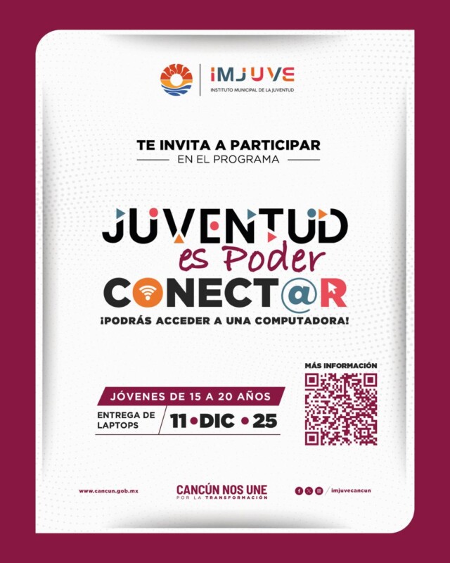 El Ayuntamiento de Benito Juárez, a través del Instituto Municipal de la Juventud (IMJUVE), presentó la convocatoria del programa “Juventud es Poder Conectar 2025”, una iniciativa que busca fortalecer el desarrollo académico de los cancunenses de entre 15 a 20 años que cursan el nivel medio superior de instituciones educativas públicas, a través de la entrega de 350 laptops.