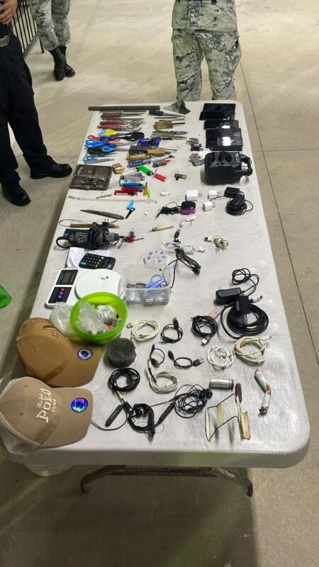 Durante la revisión en total se aseguró: cinco celulares, cuatro manos libres, 14 cables USB, una bocina, dos rastreadoras eléctricas, tres charrascas de segueta, 39 artículos usados como armas hechizas, entre puntas, desarmadores y tijeras, una máquina para tallar madera, una báscula y 133 gramos de marihuana.