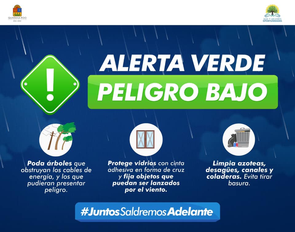 Asimismo, Alerta Verde (peligro bajo) para los municipios de Othón P. Blanco y Bacalar.