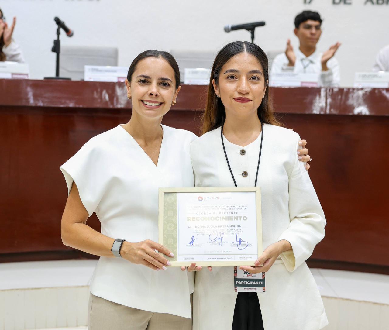 La Presidenta Municipal, Ana Paty Peralta, atestiguó la realización de la Sesión de Cabildo Juvenil 2026, en la que 17 jóvenes cancunenses de entre 18 y 29 años de edad, expusieron sus iniciativas para mejorar y transformar la ciudad en cuatro rubros importantes: empleo, salud, cultura e inclusión.