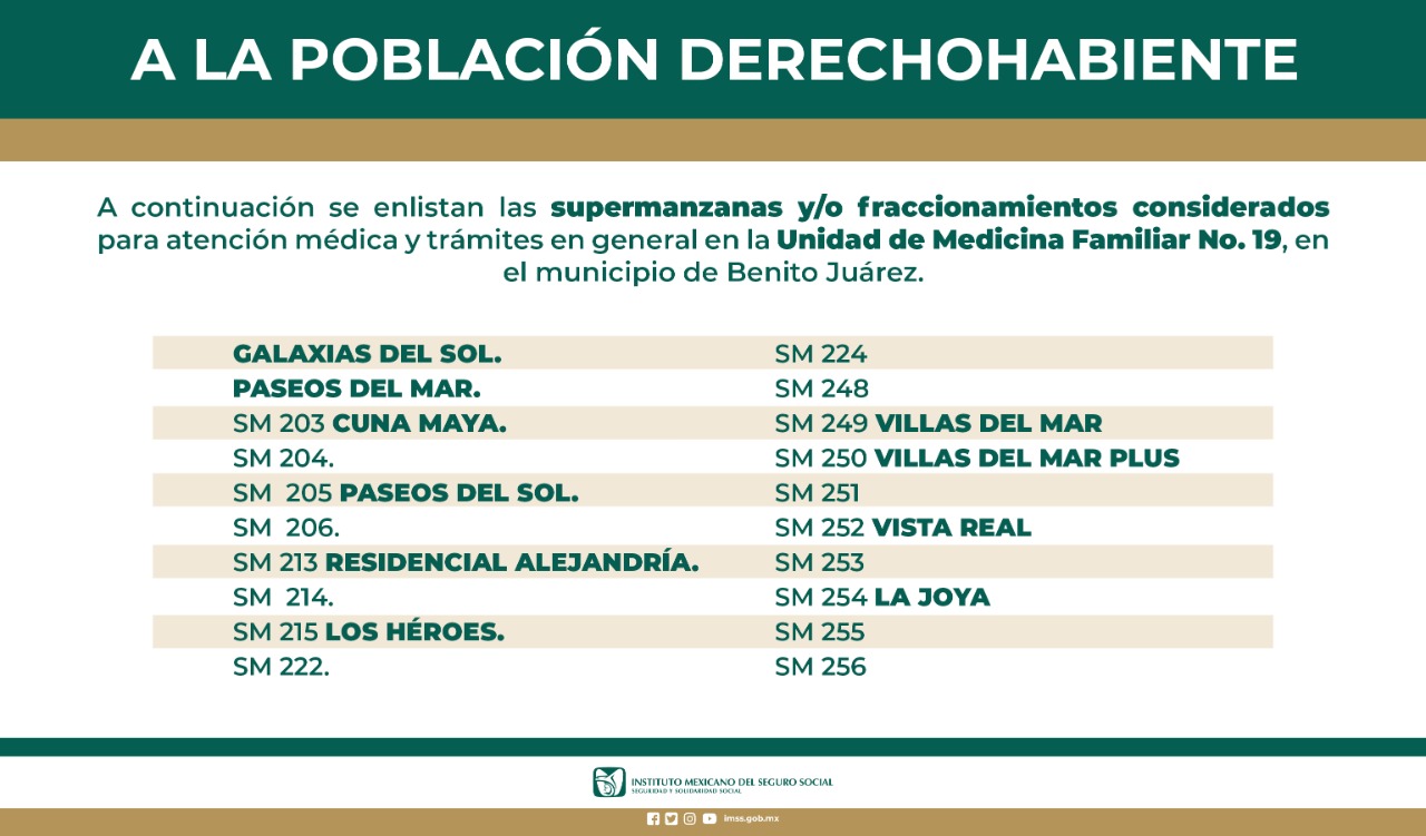 El Instituto Mexicano del Seguro Social (IMSS), a través de su coordinación de comunicación social, informó que super manzanas y colonias de Cancún serán beneficiarias con la cobertura de la nueva Unidad de Medicina Familiar (UMF) numero 19, inaugurada el día de ayer en el Fraccionamiento Los Héroes.