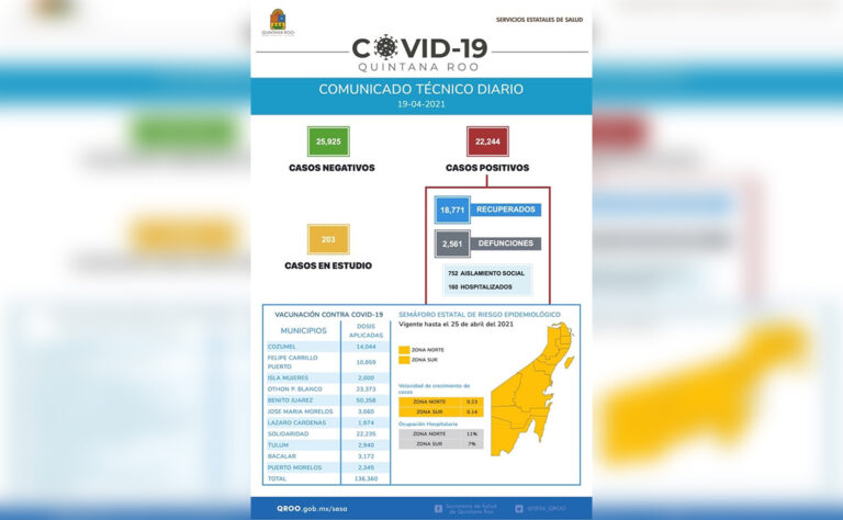 Por otra parte, en cuanto al avance en la campaña de vacunación, se han aplicado 2 mil 138 dosis de la vacuna contra el covid-19 en las últimas 24 horas, àra hacer un avance acumulado de 136 mil 360 dosis aplicadas.