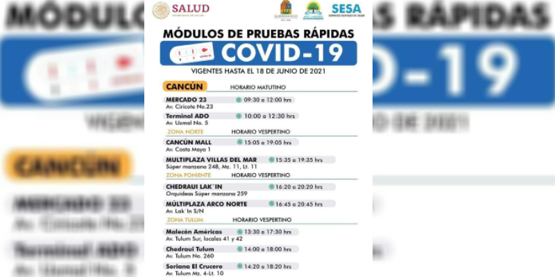 Por otra parte, se instaló un módulo en Chedraui Lakín, de 16:20 a 20:20 horas, Multiplaza Arco Norte de 16:45 a 20:45, mientras que para la zona de la avenida Tulum habrá un módulo en Malecón Américas, en los locales 41 y 42, de 13:30 a 17:30 horas, en Chedraui Tulum, de 14 a 18 horas, y finalmente en Soriana Crucero, de 14:20 a 18:20 horas.