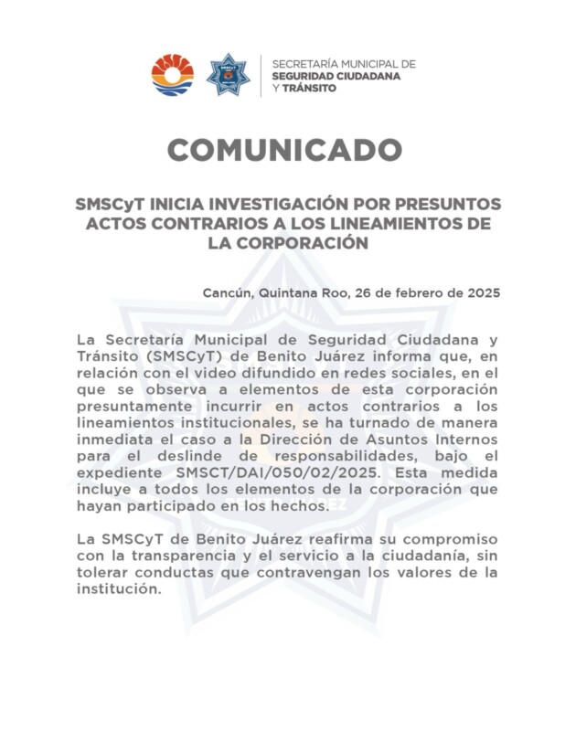 A través de un comunicado emitido este miércoles 26 de febrero, la Secretaría Municipal de Seguridad Ciudadana y Tránsito (SMSCyT) del municipio de Benito Juárez informó respecto a este video que ha circulado profusamente en redes sociales, que ya se trabaja en identificar a los policías señalados.