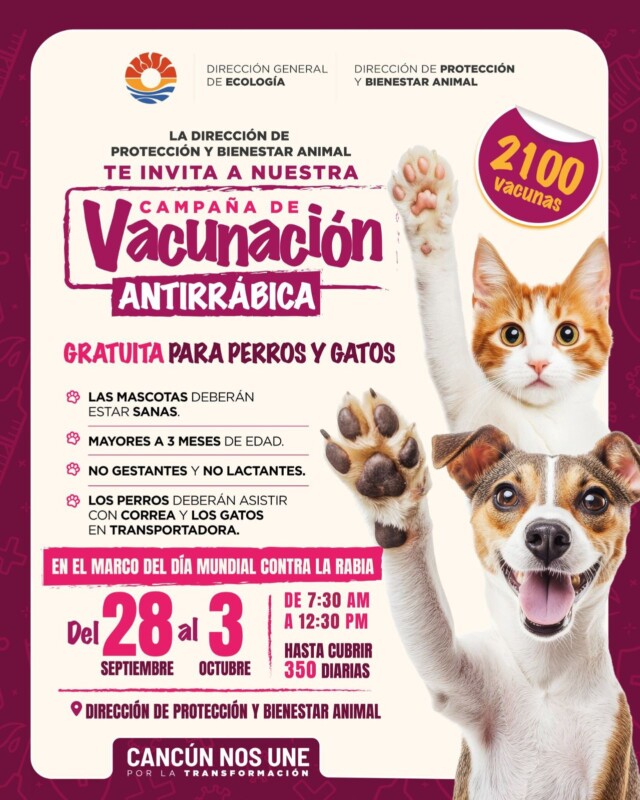 En ese sentido, destacó la importancia de mantener a los animales de compañía sanos y vacunados, e hizo un llamado a las familias cancunenses a ser responsables y acudir con sus perros y gatos bajo las siguientes condiciones: mascotas sanas, mayores a tres meses de edad; no gestantes ni lactantes; los perros deberán acudir con correa, y los gatos en transportadora.