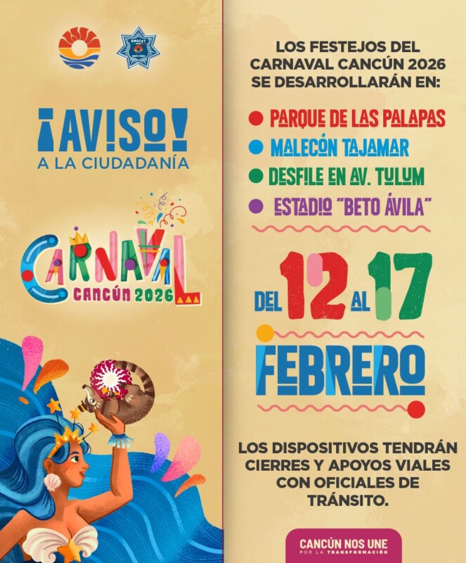 Cancún, Q. R., a 10 de febrero de 2026.- Con motivo del gran Carnaval Cancún 2026, el Ayuntamiento de Benito Juárez, a través de la Dirección de Tránsito Municipal, informó a la ciudadanía sobre los dispositivos viales implementados por las diferentes actividades que se desarrollarán del 12 al 17 de febrero, en el parque de Las Palapas, Malecón Tajamar y el Estadio “Sherwin-Wiliams”, antes “Estadio Beto Ávila”, así como el desfile en la avenida Tulum.