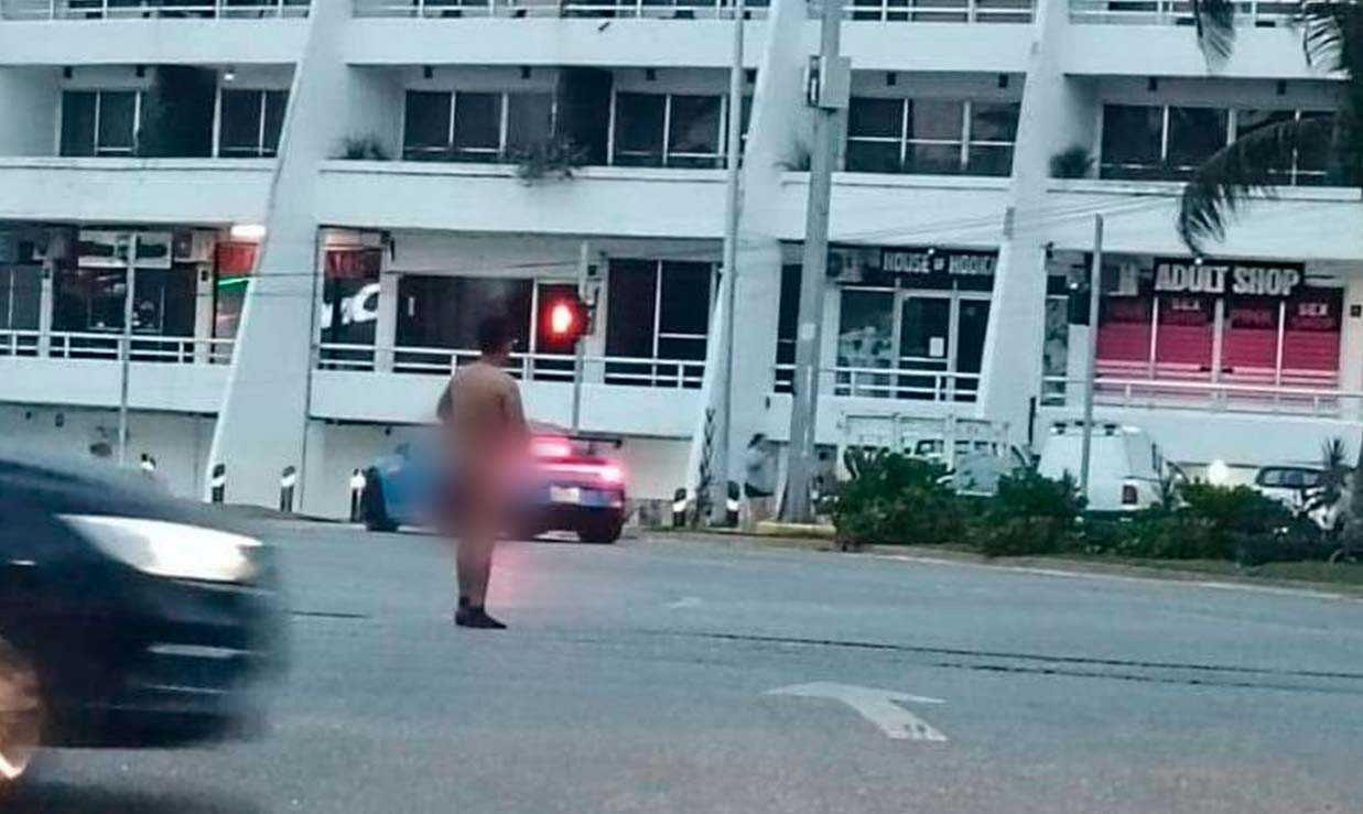 Un joven caminando desnudo en la zona hotelera de Cancún fue captado en video, que luego fue compartido en las redes sociales. Aparentemente el sujeto intentaba subirse a los autos en movimiento.