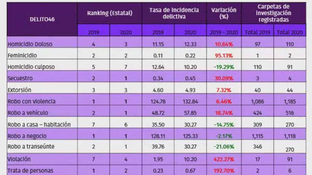 De acuerdo con el Índice de incidencia delictiva en Quintana Roo titulado “Reporte 1er. trimestre 2020”, durante el primer trimestre del año los delitos de violación y trata de personas registraron un crecimiento de 294% y 241% frente al mismo período de 2019, mientras que el homicidio culposo se redujo 3.05% y el robo a negocio 4.14%, al contabilizar 209 y mil 289 carpetas de investigación.