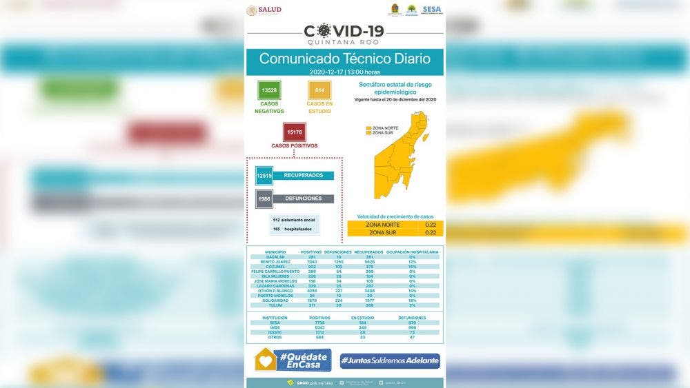 Actualmente 614 personas están en estudio, 512 en aislamiento social, y 165 en hospitalización, Solidaridad tiene el 18% de ocupación hospitalaria, al 16 está Cozumel, al 14 OPB, al 12Benito Juárez, y al 2% Tulum.