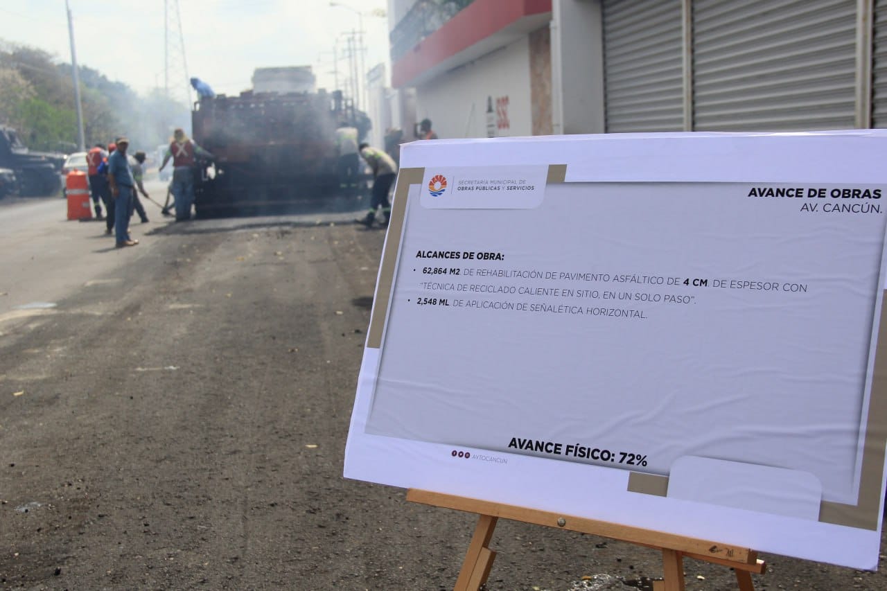 Cancún.- Con el compromiso de mantener acciones de obra pública para beneficio de automovilistas y transeúntes, el encargado de Despacho de la Presidencia Municipal de Benito Juárez, Pablo Gutiérrez Fernández, informó que la rehabilitación de pavimento asfáltico en sitio por medio de aire caliente y colocación de la nueva carpeta en un solo paso de la avenida Cancún, suma un 95% de avance.