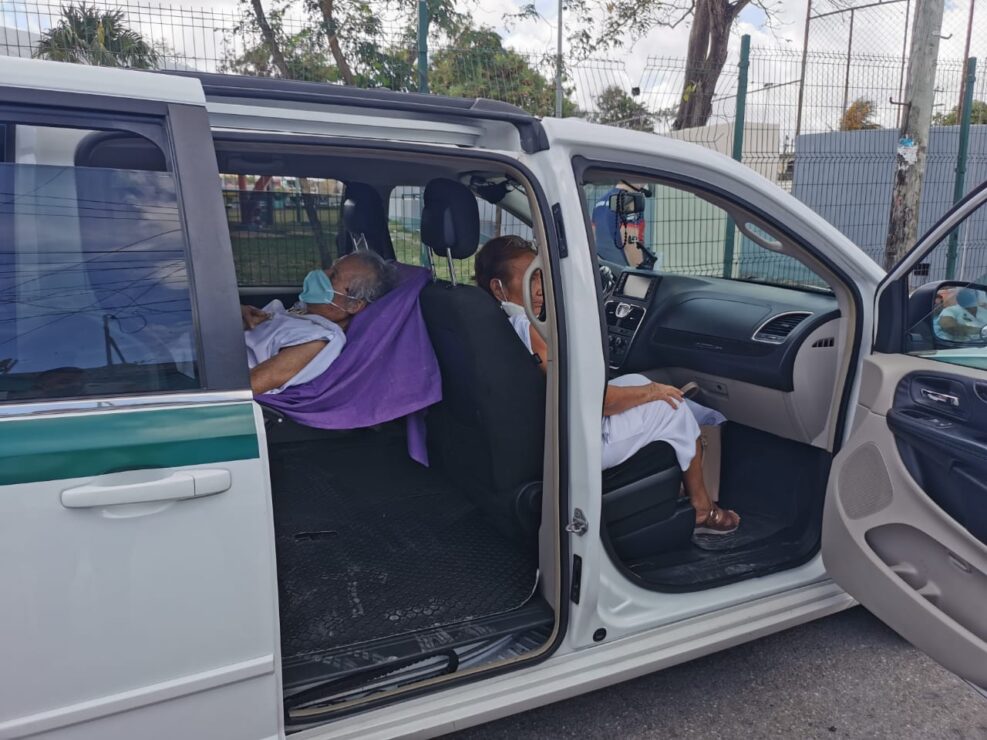 Adultos mayores que se encuentran postrados también son llevados a ser vacunados, como el caso de Eugenio de la O, de 87 años, quien fue llevado por su hijo, y el cual tuvo que ser inmunizado fuera del domo de la Región 94.