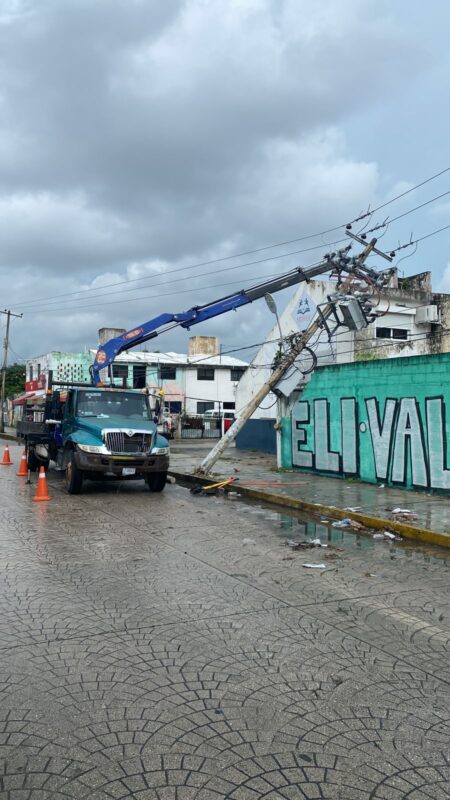 Ardua labor de trabajadores de Comisión Federal de Electricidad (CFE) esta mañana debido a las lluvias, luego de que la caída constante de agua debilitará la estructura de un poste en la Súpermanzana 26 de Cancún, y un rayo cayó sobre un transformador en la Súpermanzana 219.