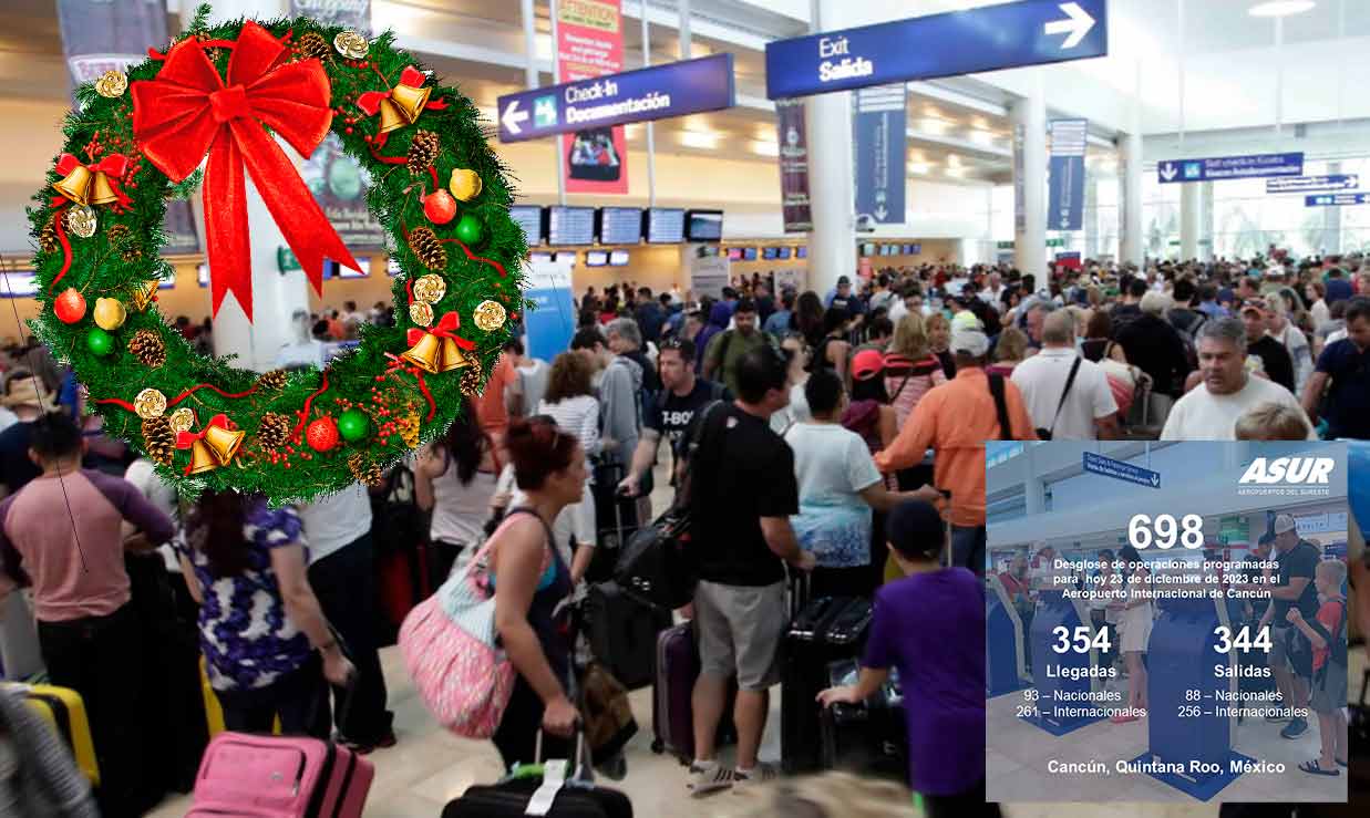 Tal y como se esperaba, el Aeropuerto Internacional de Cancún (AIC) logró disparar su número de operaciones aéreas en esta jornada sabatina del 23 de diciembre, en víspera de la celebración navideña de nochebuena, se consiguió la excelente cifra de 698 vuelos.