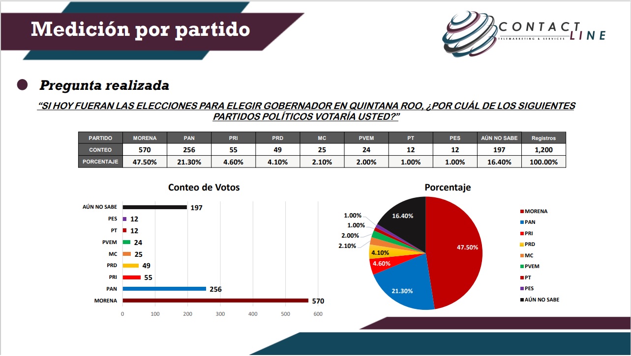 En cuando a la presunta: Si hoy fueran las elecciones para elegir gobernador en Quintana Roo, ¿por cuál de los siguientes actores políticos votaría usted?, el ingeniero Alegre Salazar obtuvo un 31.50%, más de 4 puntos por arriba de los aspirantes de otros institutos políticos.