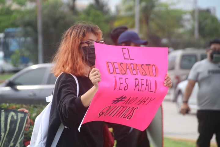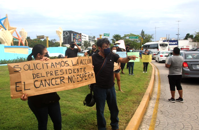 El desabasto de medicamentos oncológicos e insumos para la aplicación de quimioterapias contra el cáncer, que han acaparado la agenda nacional en los últimos días, permeó esta tarde en la ciudad de Cancún en donde al menos unas setenta personas participaron en una manifestación por esta causa en la icónica glorieta del cebiche.