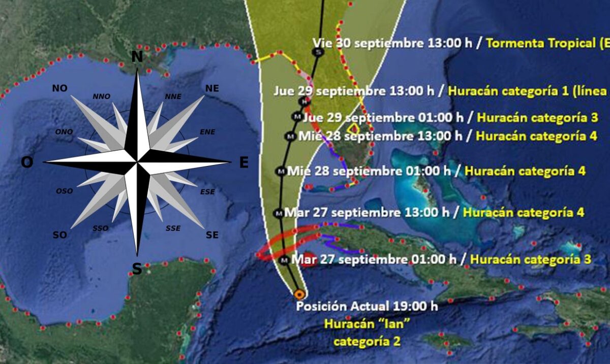 De acuerdo a la dependencia meteorológica, “Ian” se mantiene como huracán de categoría 2 en la escala Saffir-Simpson, y su centro se localiza al este de las costas de Quintana Roo, mientras mantiene su trayectoria hacia el occidente de Cuba.
