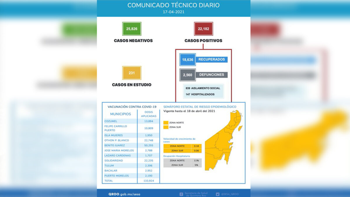 Según los datos del comunicado que elabora la dependencia, hasta el 17 de abril se tienen 22,182 casos positivos al covid-19, 2,560 decesos y avance acumulado de 133 mil 924 dosis de la vacuna aplicadas.