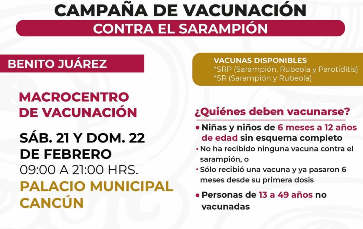 Explicó que las personas deberán acudir con la Cartilla Nacional de Salud y la Clave Única de Registro de Población (CURP) a los módulos de vacunación, donde se aplican las vacunas contra el sarampión, rubéola y parotiditis (paperas), de manera gratuita y segura para que todas y todos complementen su esquema básico de vacunas.