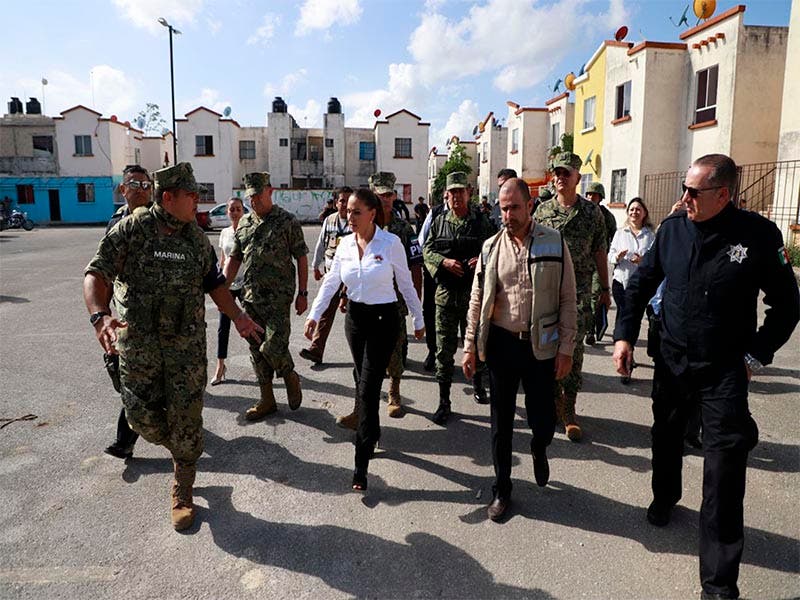 Mara Lezama recorre el fraccionamiento Villas Otoch con altos mandos de la Armada de México y Defensa Nacional.