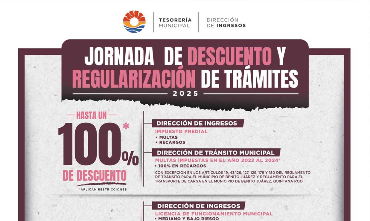 El Ayuntamiento de Benito Juárez, a través de varias dependencias, invita a los ciudadanos a aprovechar la Jornada de Descuento y Regularización de Trámites 2025 que estará vigente hasta el próximo 31 de diciembre, con incentivos que van desde el 20 hasta el 100 por ciento menos en varios trámites y permisos municipales.