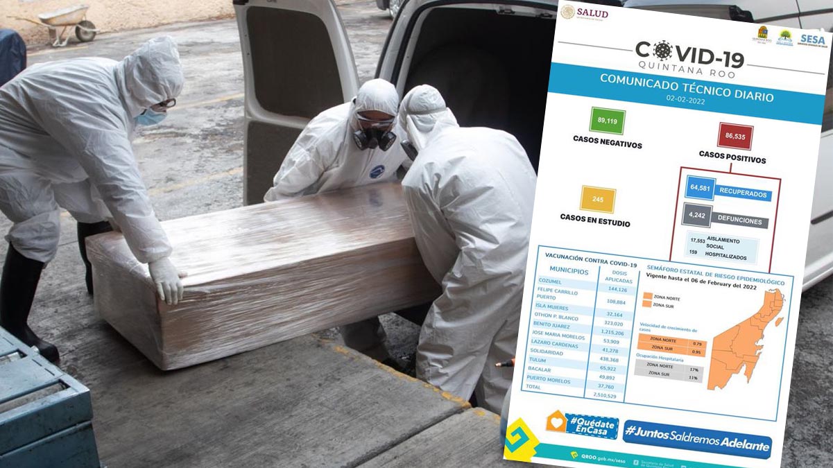 Con las 16 personas fallecidas en las ultimas 24 horas, Quintana Roo acumula ya un total de 4 mil 242 muertes, en tanto que el acumulado permanente de casos escaló hoy a 86 mil 535 contagiados con una nueva tanda de 656 nuevos contagios reportados el día de hoy.