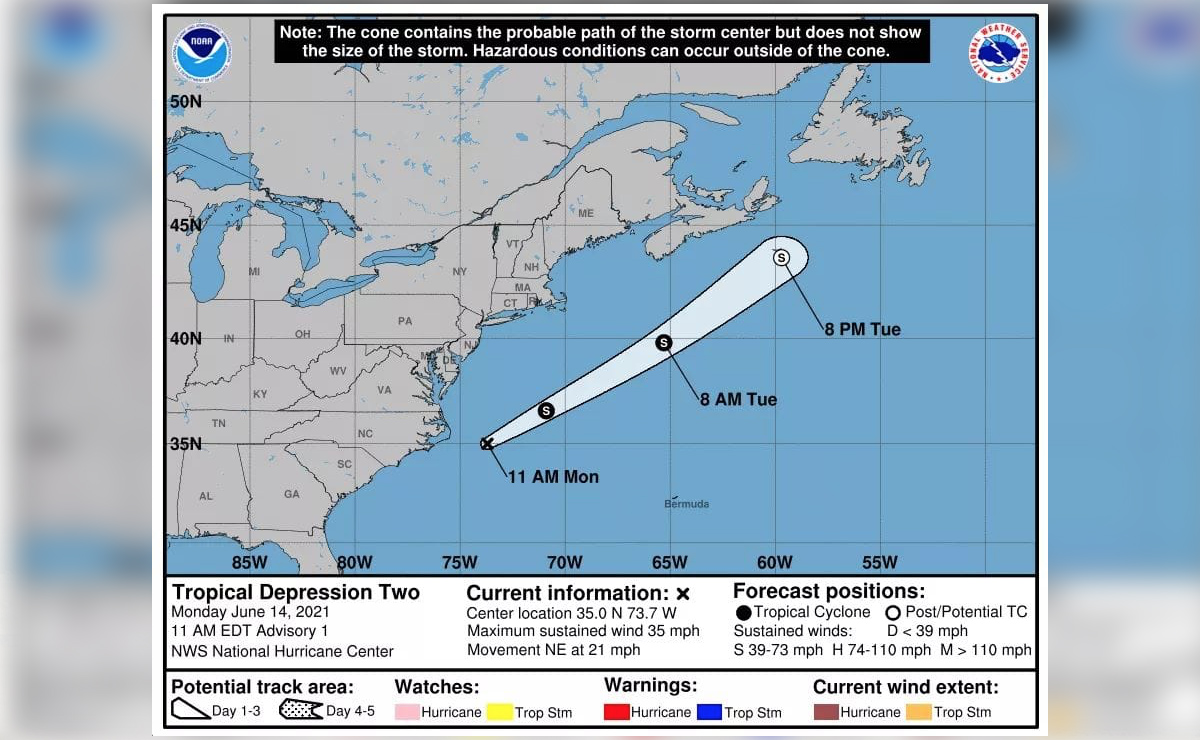 Nace la segunda depresión tropical de la temporada. Este lunes por la mañana se formó la depresión tropical número Dos, en el océano atlántico norte, y se espera que esta misma noche se convierta en la segunda Tormenta Tropical de la temporada, llevaría por nombre “Bill”, según el listado de nombres de este 2021.