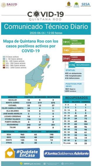 En el marco de la nueva normalidad, los casos por municipio se distribuyen de la siguiente manera: Benito Juárez 151 casos positivos, 319 defunciones y 875 recuperados; Solidaridad con 340 positivos, 57 defunciones y 201 recuperados; en Cozumel 52 contagiados, 13 defunciones y 27 recuperados.