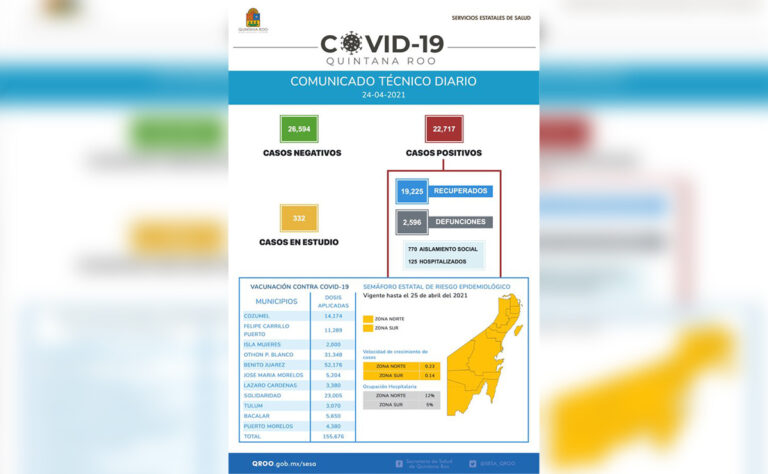 Paralelamente, la dependencia de salud indicó que hasta el día de hoy se han aplicado 155 mil 676 dosis de la vacuna contra el covid-19, con las mil 19 inoculadas en las ultimas 24 horas.