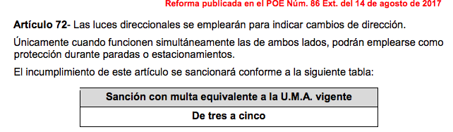 El Reglamento de Tránsito municipal de Benito Juárez, contempla que el incumplimiento del artículo 72 (evitar usar la luz direccional) impone una multa que va de tres a cinco Unidades de Medida y Actualización (UMA), que a un valor actual de 96.22 pesos por cada una determina el pago de hasta 481 pesos.