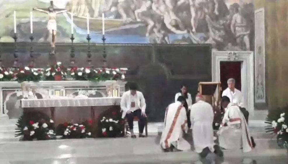 El obispo Pedro Pablo Elizondo lavó en el Jueves Santo los pies a tres médicos durante la misa conmemorativa a la última cena, desde la réplica de la Capilla Sixtina de Cancún.