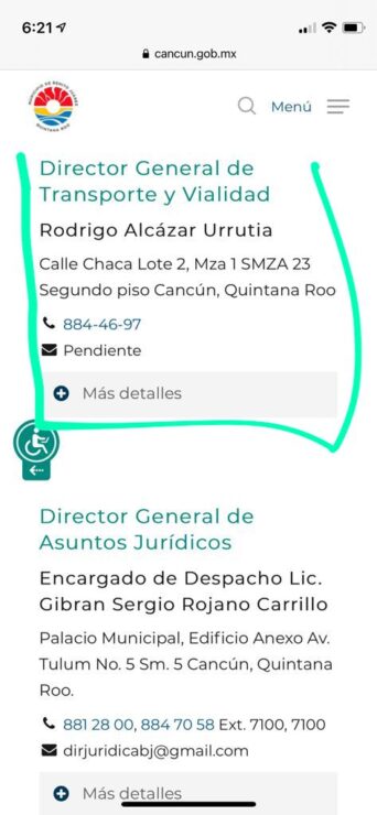 Hasta las 7 horas de este jueves, Rodrigo Alcázar aparecía aún en el portal oficial del Ayuntamiento como director de Transporte y Vialidad del Ayuntamiento de Benito Juárez.