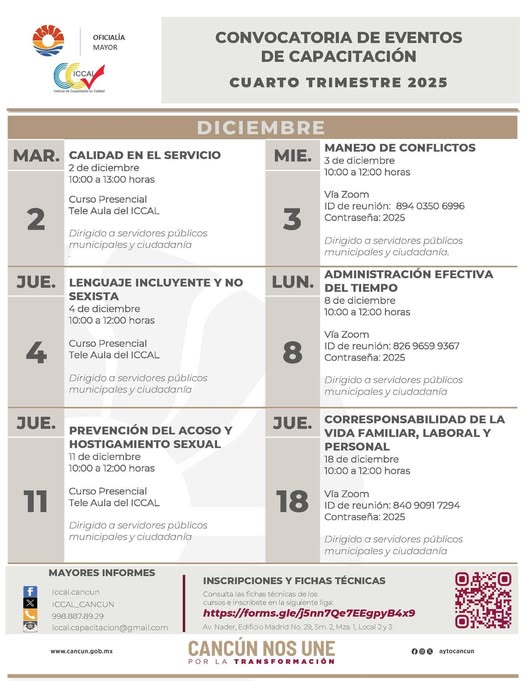 Cancún, Q. R., a 1 de diciembre de 2025.- El Ayuntamiento de Benito Juárez, a través del Instituto de Capacitación en Calidad (ICCAL), concluirá este cuarto cuatrimestre del 2025 con el ciclo de eventos de capacitación a partir del martes 2 de diciembre hasta el jueves 18 de este mes, con un amplio y variado contenido de temas de interés general gratuitos para servidores públicos o los ciudadanos interesados.