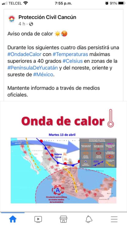 Ola de calor en Cancún a partir de mañana, la Dirección de Protección Civil de Benito Juárez, a través de sus redes sociales anticipó un fin de semana marcado por una intensa oleada de calor que podría superar los 40 grados celcius.