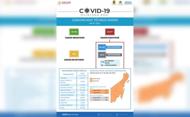 También se informa, que dentro de los esfuerzos de contención de la pandemia, se han aplicado hasta el momento un total de 757 mil 585 dosis de la vacuna contra el covid-19 en Quintana Roo.