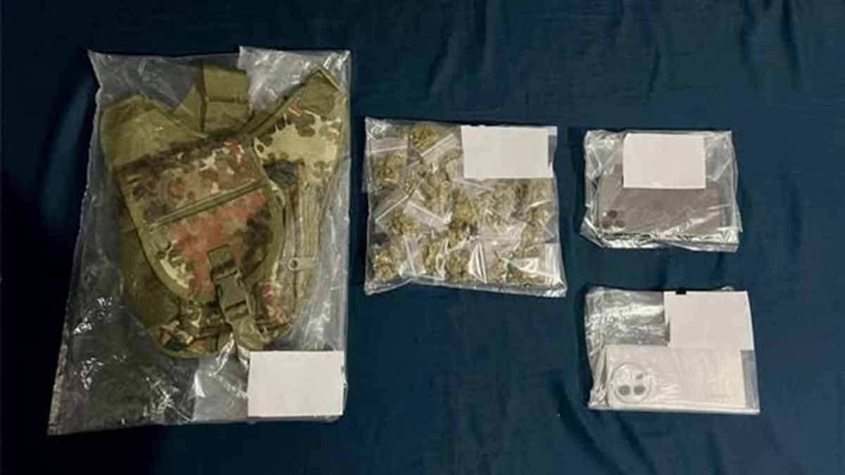 Durante la revisión, los elementos de seguridad localizaron diversos indicios que fueron integrados a la investigación. Entre los objetos asegurados se encuentra una mochila táctica tipo pechera, así como 40 bolsitas de plástico transparentes tipo ziploc que contenían vegetal de color verde con características similares a la marihuana.