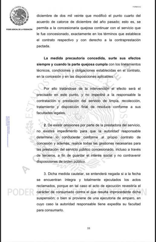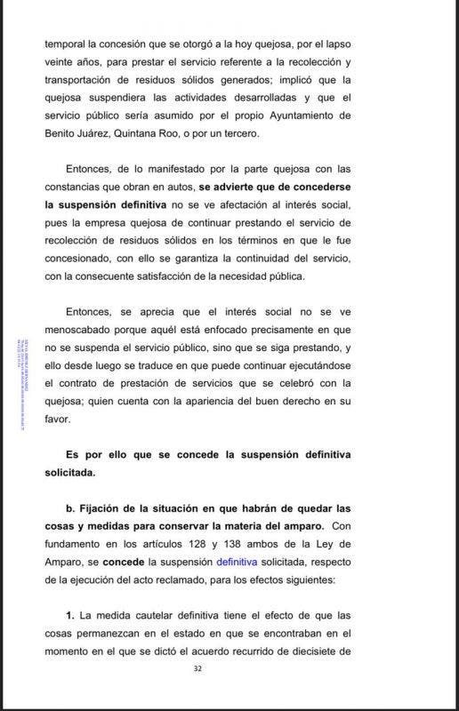 El mandato fue decretado respecto de los actos reclamados por la concesionaria Intelligencia México S.A., al Ayuntamiento de Benito Juárez y a Solución Integral de Residuos Sólidos, Cancun (Siresol), que fue despojada de su concesión para entregar el negocio de la basura a una empresa particular.