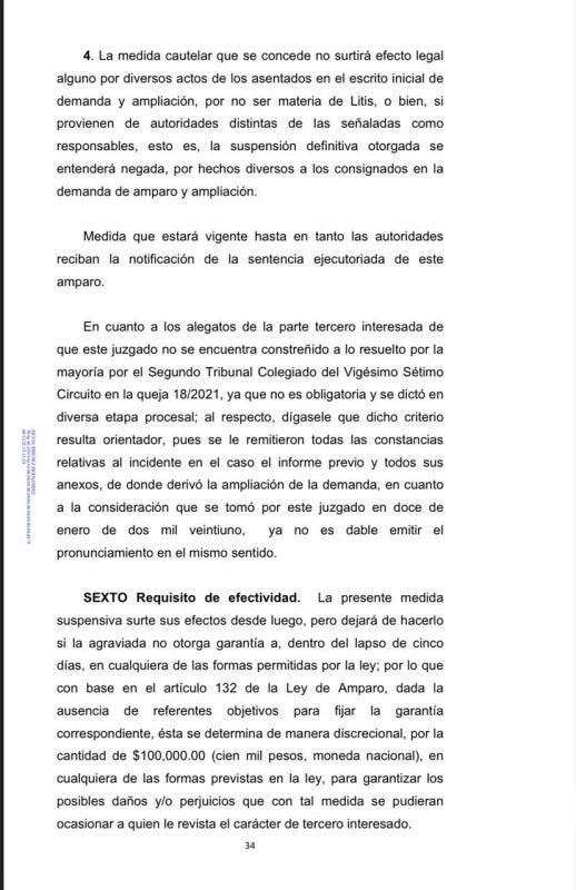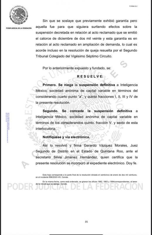 El Juzgado Segundo de Distrito consideró que con la suspensión definitiva concedida, no se afectará al erario, ni el interés social, en la medida que ambas empresas cobran por tonelaje recogido, de modo que el gasto erogado será siempre igual; más aún, más barato, ya que todo el tonelaje recogido por Intelligencia México se pagará a la mitad del precio de lo que el Ayuntamiento pactó pagarle en el contrato ilegal a Red Ambiental.