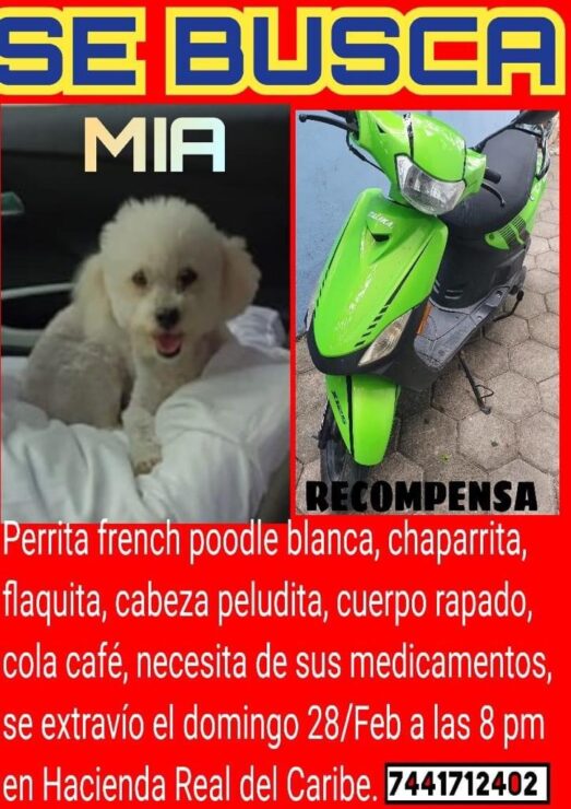 Mía, una hermosa perrita French Poddle lleva ya varias semanas perdida en la que sus dueños, una joven pareja de la ciudad de Cancún la ha buscado incesantemente.