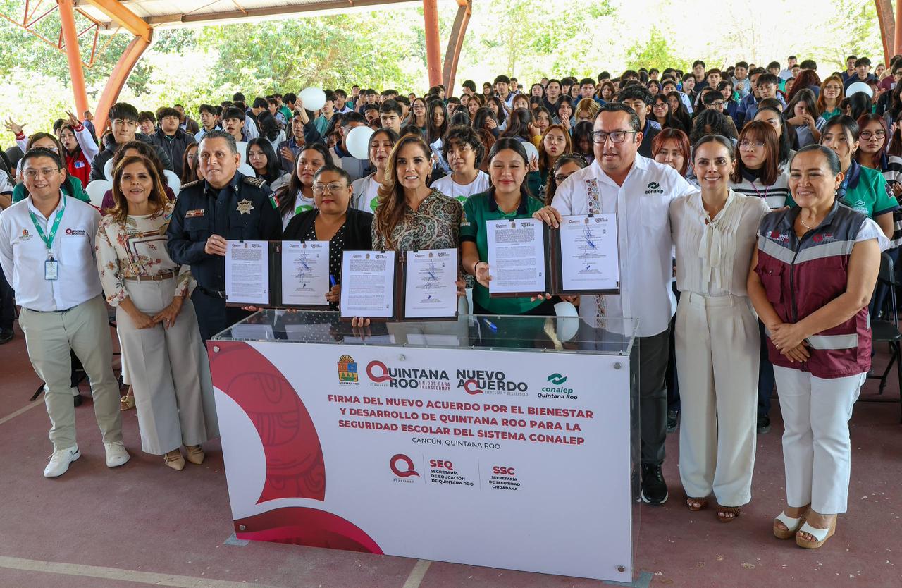 La Presidenta Municipal, Ana Paty Peralta, firmó como testigo de honor el Nuevo Acuerdo por el Bienestar y Desarrollo de Quintana Roo para la Seguridad Escolar del Sistema Colegio Nacional de Educación Profesional y Técnica (CONALEP) encabezada por la gobernadora, Mara Lezama, con el objetivo de fortalecer los protocolos de actuación ante emergencias y situaciones de violencia en entornos escolares, por medio de videovigilancia del Complejo de Seguridad Quintana Roo C5.