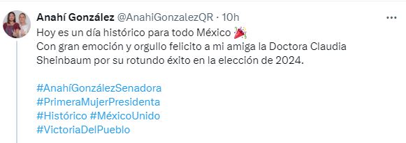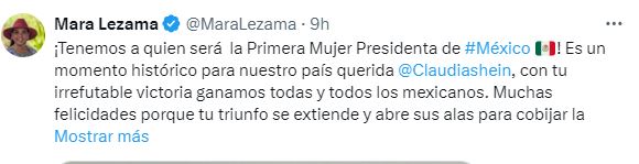 “¡Tenemos a quien será la Primera Mujer Presidenta de #México! Es un momento histórico para nuestro país, querida @Claudiashein, con tu irrefutable victoria ganamos todas y todos los mexicanos. Muchas felicidades, porque tu triunfo se extiende y abre sus alas para cobijar la lucha, los sueños y la gran esperanza, de todas las mujeres de este país.