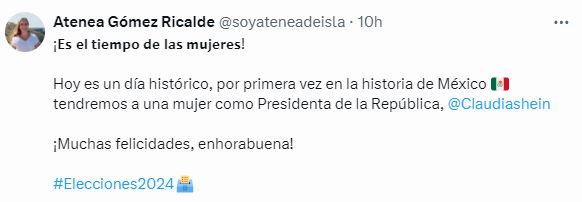 “¡Es el tiempo de las mujeres! Hoy es un día histórico, por primera vez en la historia de México tendremos a una mujer como Presidenta de la República, @Claudiashein. ¡Muchas felicidades, enhorabuena!”, posteó la virtual presidenta municipal de Isla Mujeres, Atenea Gómez Ricalde.