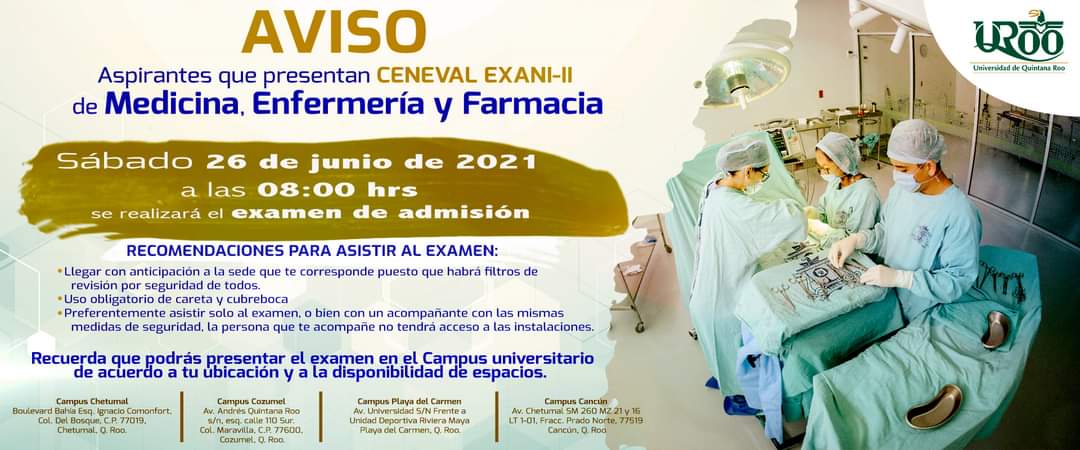 La Universidad de Quintana Roo pospuso la aplicación del examen de admisión EXANI-II Ceneval para los aspirantes a cursar las Licenciaturas de Enfermería, Farmacia y Medicina de la División Ciencias de la Salud (DCS), que estaba programado para el 15 de mayo y estableció como nueva fecha el 26 de junio, el motivo es la vigencia del color naranja del Semáforo Epidemiológico Estatal y los protocolos de seguridad sanitaria para evitar el contagio del Covid-19, confirmó la jefa del Departamento de Control Escolar, Mtra. Angelina Yah Torres.