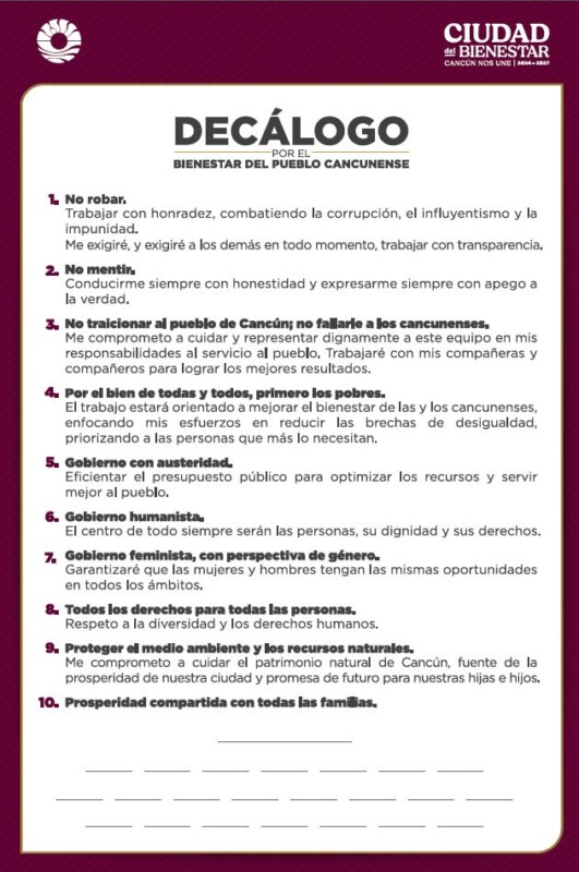 Para ello, agregó, se contará con el Decálogo por el Bienestar del Pueblo Cancunense, que va a ser una guía y un documento rector con principios y valores en cada oficina y dirección para asumirse como verdaderos servidoras y servidoras del bienestar.