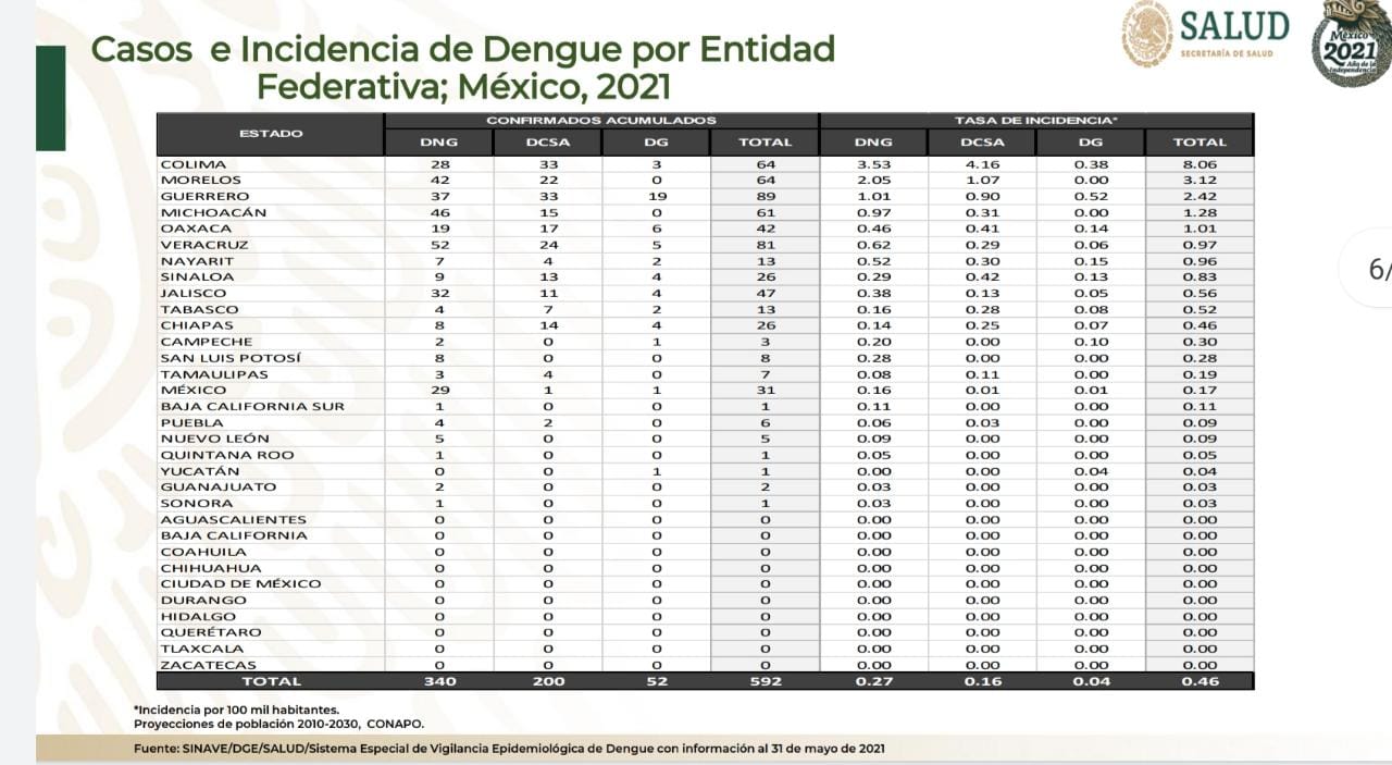 En los primeros lugares con más casos están Guerrero con 89, seguido de Veracruz con 81, mientras que la tercera posición la comparten con 64 casos Colima y Morelos.