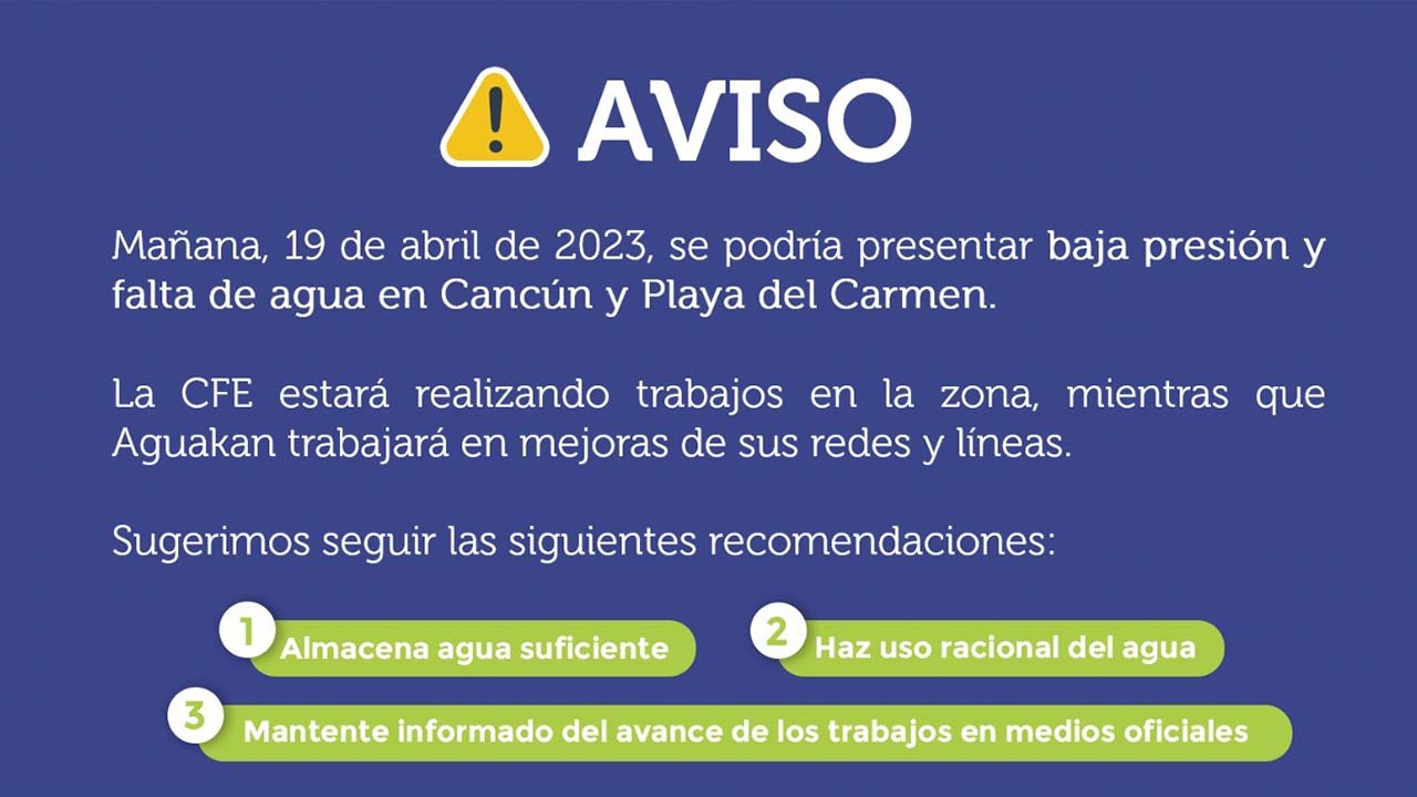 Se comunica a la ciudadanía que el miércoles 19 de abril, la Comisión Federal de Electricidad (CFE) realizará trabajos de mantenimiento eléctrico en el Boulevard Luis Donaldo Colosio, lo que afectará el suministro de agua de los principales cárcamos y estaciones de bombeo de Aguakan. Simultáneamente y para minimizar posteriores afectaciones a la ciudadanía, Aguakan realizará tareas de mantenimiento y mejoras en sus sistemas en Cancún y Playa del Carmen.