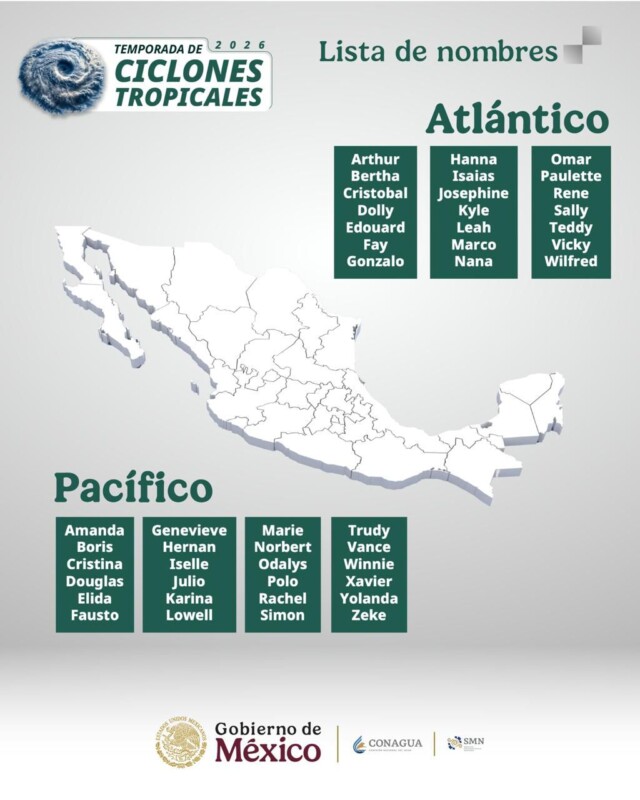 El pronóstico oficial de la temporada de ciclones tropicales 2026 en el Atlántico fue a dado a conocer por la Comisión Nacional del agua (Conagua), en la que se prevé la formación de entre 11 y 15 sistemas tropicales.