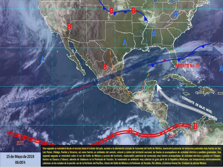 El ambiente muy caluroso se mantendrá en gran parte México, con temperaturas extremadamente calurosas en el sur de la vertiente del Pacífico, el litoral del Golfo de México y la Península de Yucatán, valores superiores a 45 grados Celsius en Michoacán, Guerrero, Campeche y Yucatán.