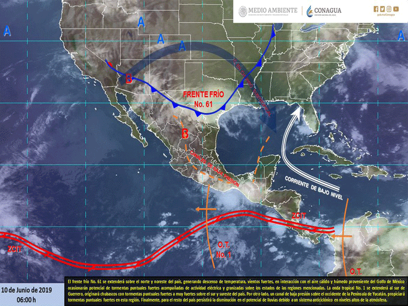 Por otro lado, la onda tropical número 1 se extenderá al sur de Guerrero, originará chubascos con tormentas puntuales fuertes a muy fuertes sobre el sur y sureste del país.